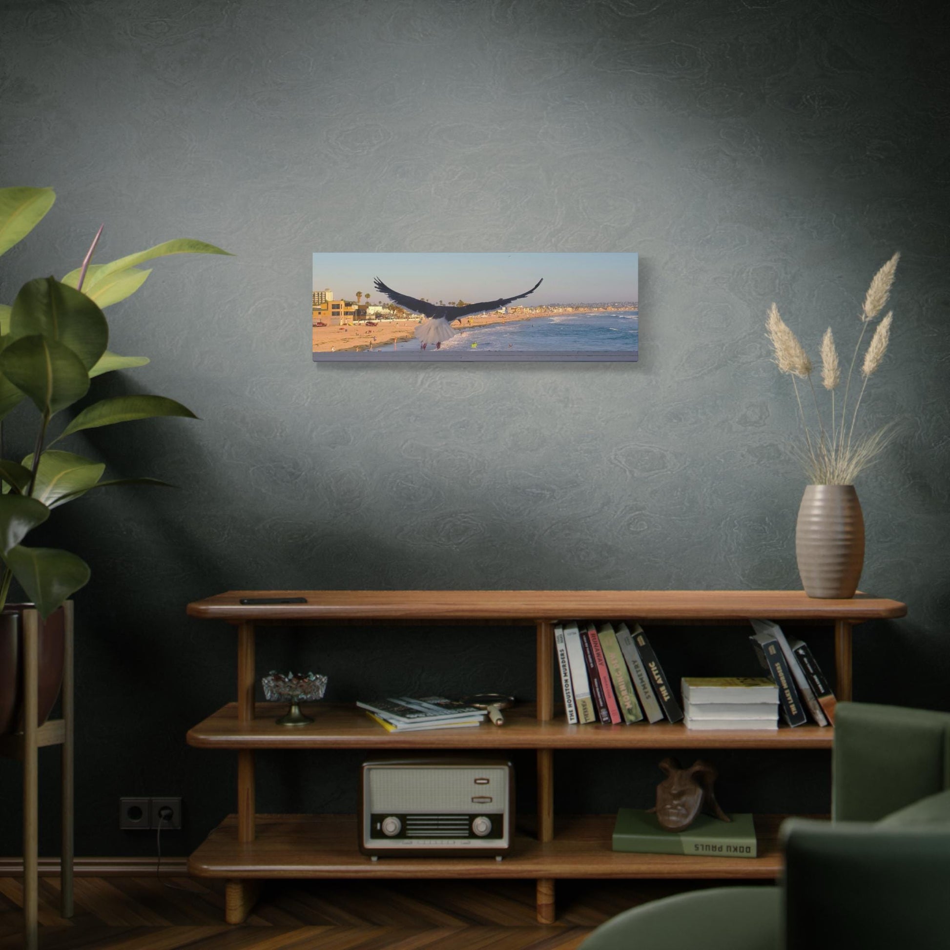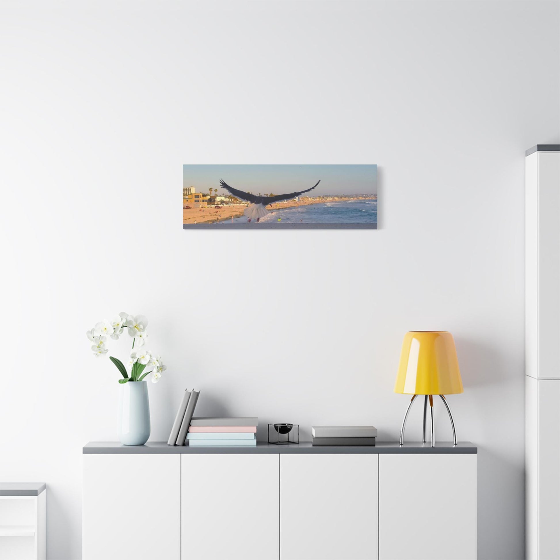 Create a peaceful atmosphere in your home with this serene beach canvas featuring a bird taking flight over a boardwalk. Perfect for nature lovers and those looking to add a touch of tranquility to their space. Ideal for beach house decor, coastal themed rooms, and as a gift for nature enthusiasts or beachgoers.